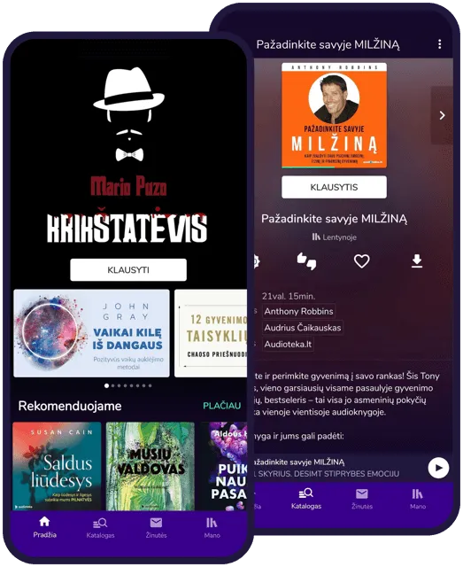 Klausykitės žymių saviugdos autorių – Dale Carnegie, Susan Cain, Tony Robbins ir daugelio kitų – audioknygų. Mėgaukitės įtraukiančia grožine literatūra – „Vėjo nublokšti”, „Šauniojo kareivio Šveiko nuotykiai”, „Altorių šešėly”, „Gyvulių ūkis” ir kt. Jūsų laukia ir audioserialai, meditacijų įrašai, trumpos istorijos bei Audioteka „šortai”.
